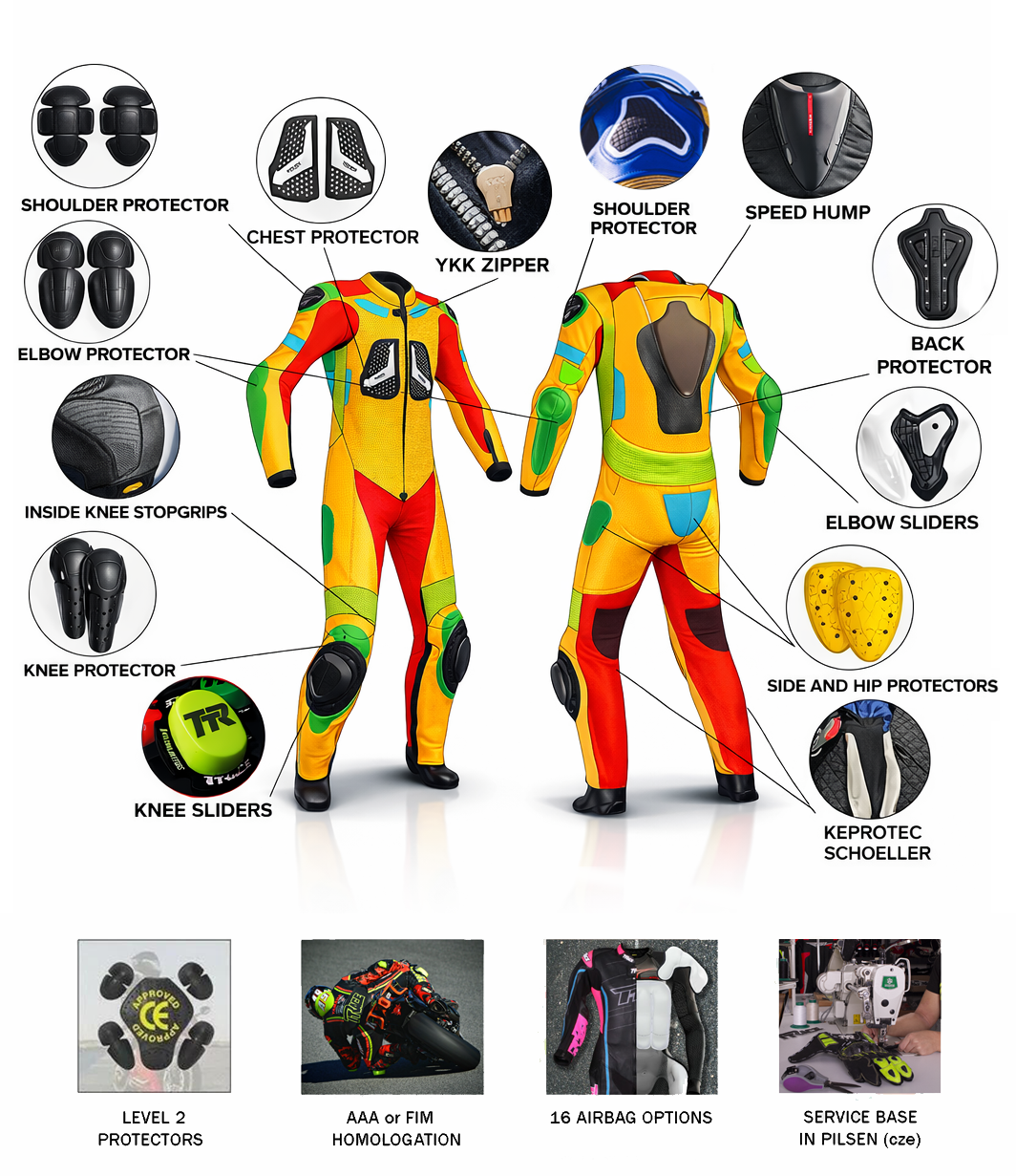 Profesionální jednodílná nebo dvoudílná závodní kombinéza, navržená a šitá na míru s důrazem na maximální bezpečnost, komfort a individuální styl.